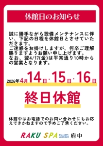 2026年4月14日~4月16日_休館日のお知らせ 2026年03月30日 設備メンテナンスに伴い、2026年4月14日~4月16日の3日間を 休館日とさせていただきます。 お客様には大変ご不便をおかけいたしますが、ご理解賜りますようお願い申し上げます。