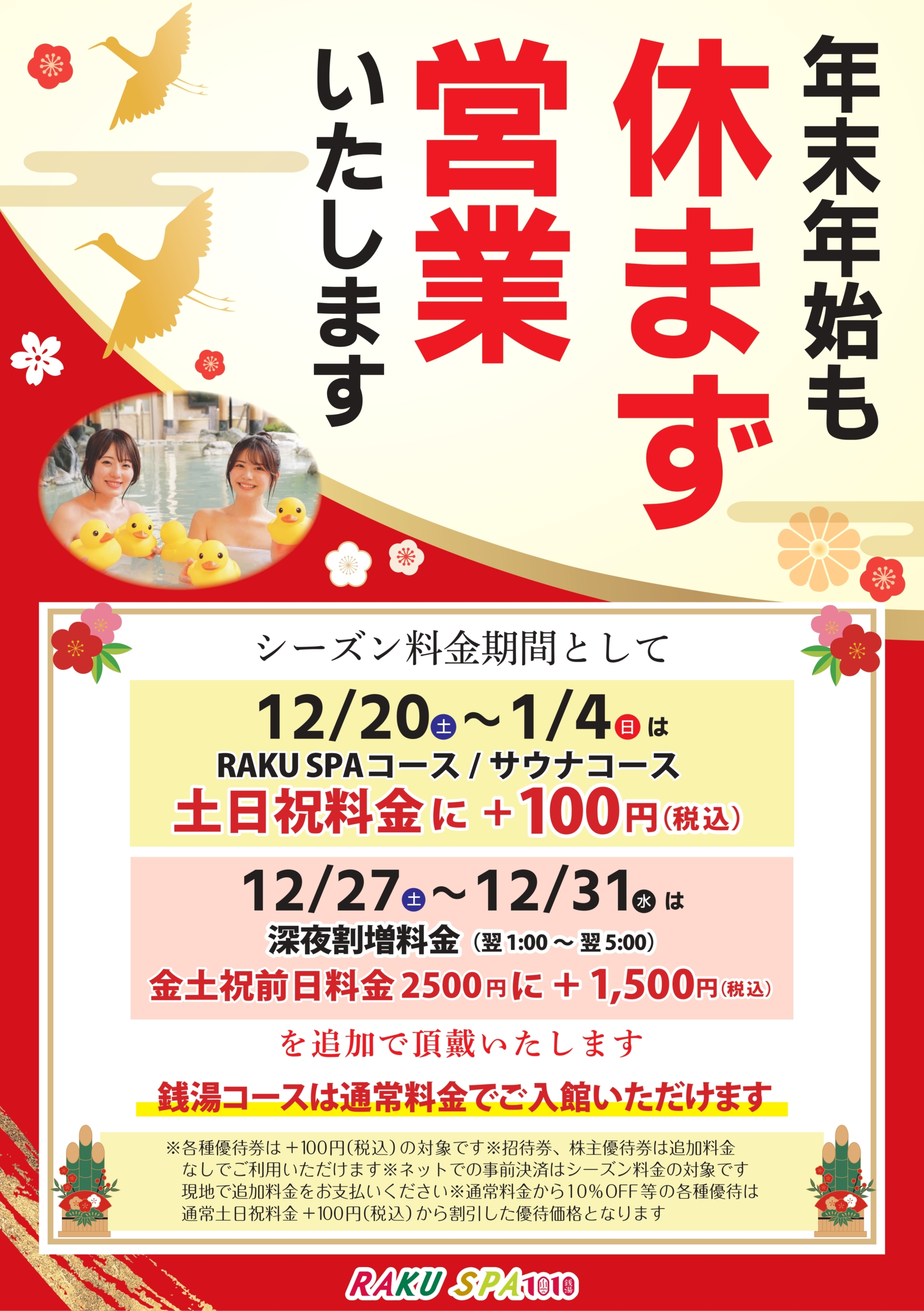 2025年12月20日(土)~【シーズン料金のお知らせ】 2025年12月02日 2025年12月20日(土)~2026年1月12日(月)の期間中は、シーズン料金として RAKUSPAコースは全日2,470円/サウナコースは全日1,470円とさせて頂きます。 なお、12月27日(土)~12月31日(水)の期間中は、深夜割増料金を4,000円で営業いたします。 ご理解賜りますようお願い申し上げます。