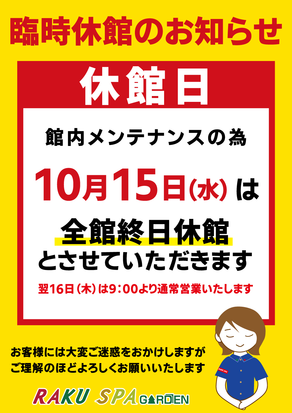 10月15日(水) 臨時休館のお知らせ