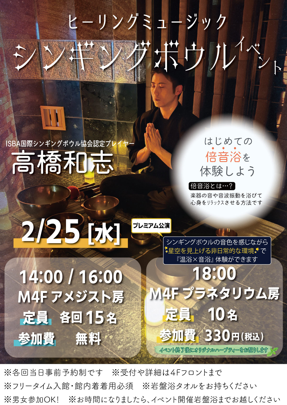 岩盤浴(アメジスト,プラネタリウム房)にてシンギングボウルの演奏による瞑想プログラムを行っていただきます!!