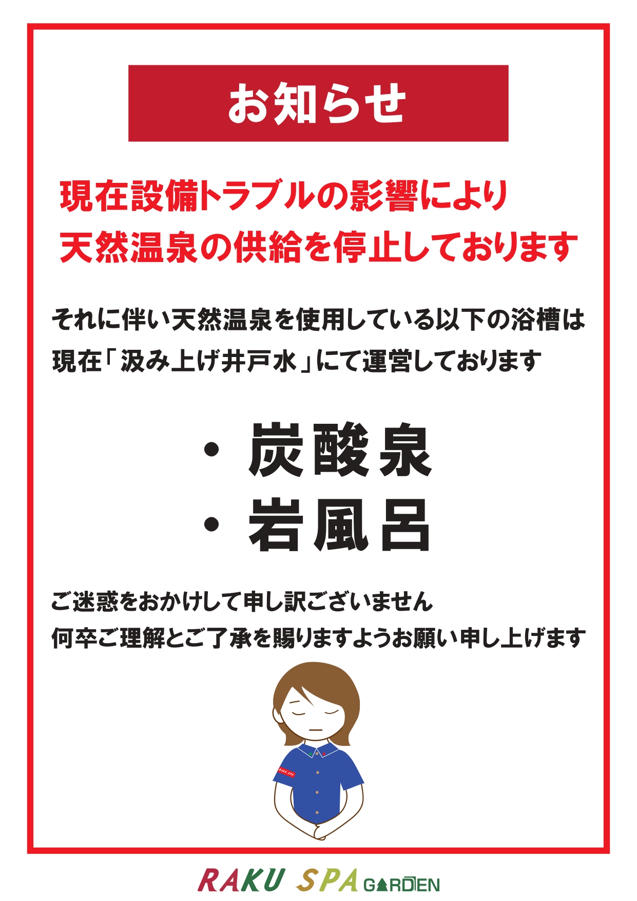 [お知らせ] 設備トラブルによる天然温泉の供給停止について
