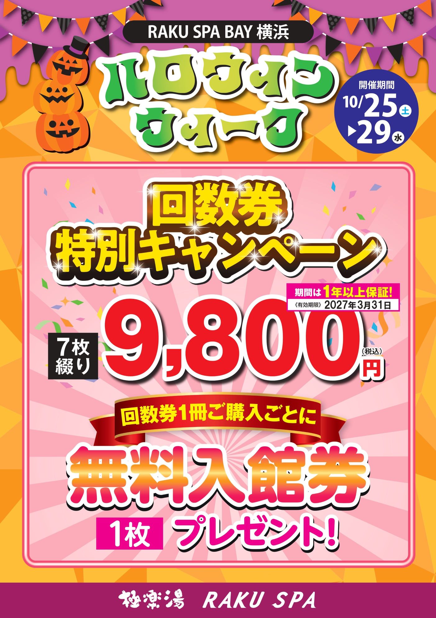 回数券キャンペーンのお知らせ 2025年10月20日 \10月25日(土)~29日(水)の5日間限定!/ 回数券1冊ご購入ごとに無料入館券を1枚プレゼント! このチャンスをお見逃しなく!ご家族やお友だちと一緒に、RAKU SPAで心も体もリフレッシュしませんか?