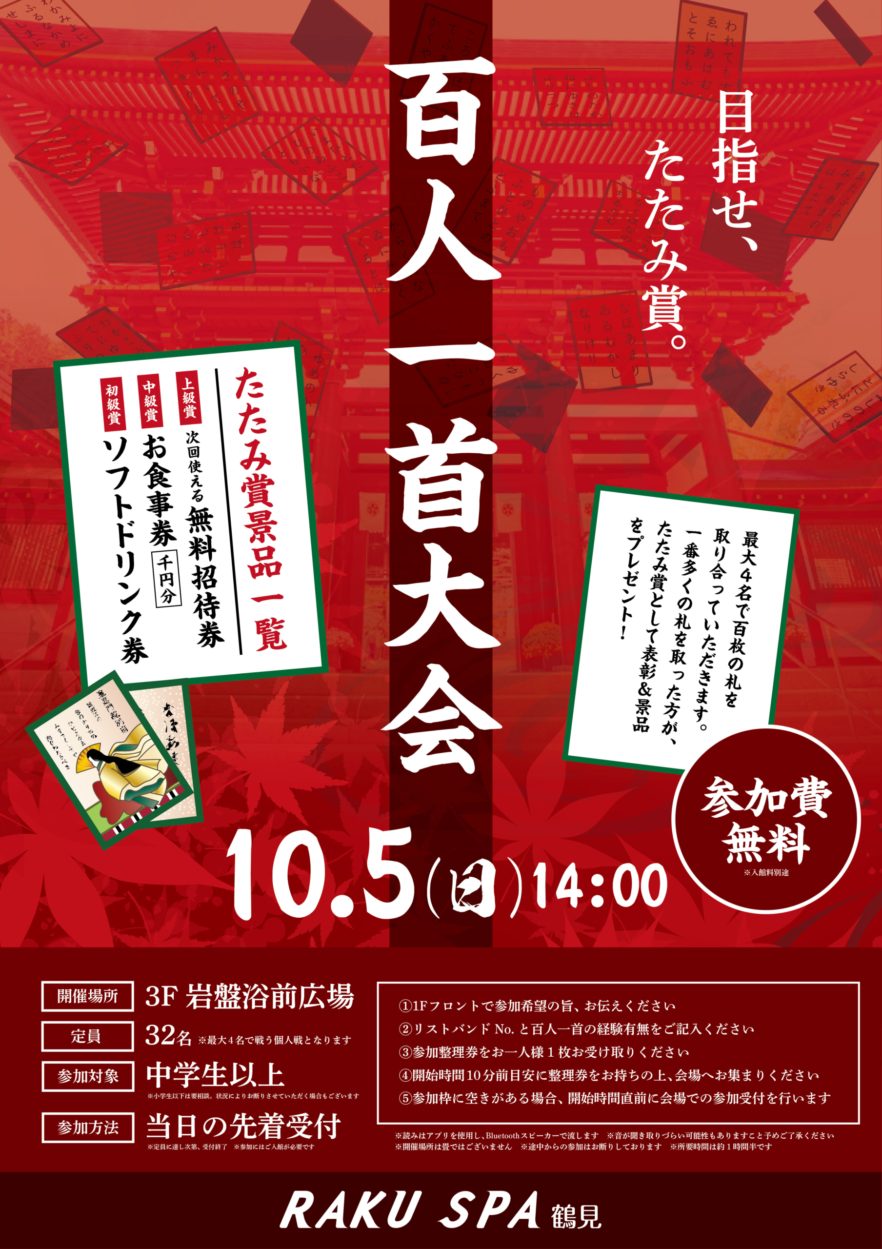 【10/5開催】復活!!百人一首大会 2025年10月01日 \5か月ぶりの復活!!『百人一首大会』開催決定!!/ RAKU SPA鶴見の恒例イベントとして毎月実施していた、百人一首大会。 5月を最後にイベントの開催はしておりませんでしたが… 10月に一度きりの復活が決定いたしました!! 今回は、参加枠を増やし最大32名様ご参加可能に! さらに、会場を3F岩盤浴前広場にいたしました。 初心者の方も、上級者の方も!皆さまのご参加、お待ちしております! ※ご参加には入館が必要です ※イベントは予告なく変更となる可能性がございます ※11月以降の開催は未定です