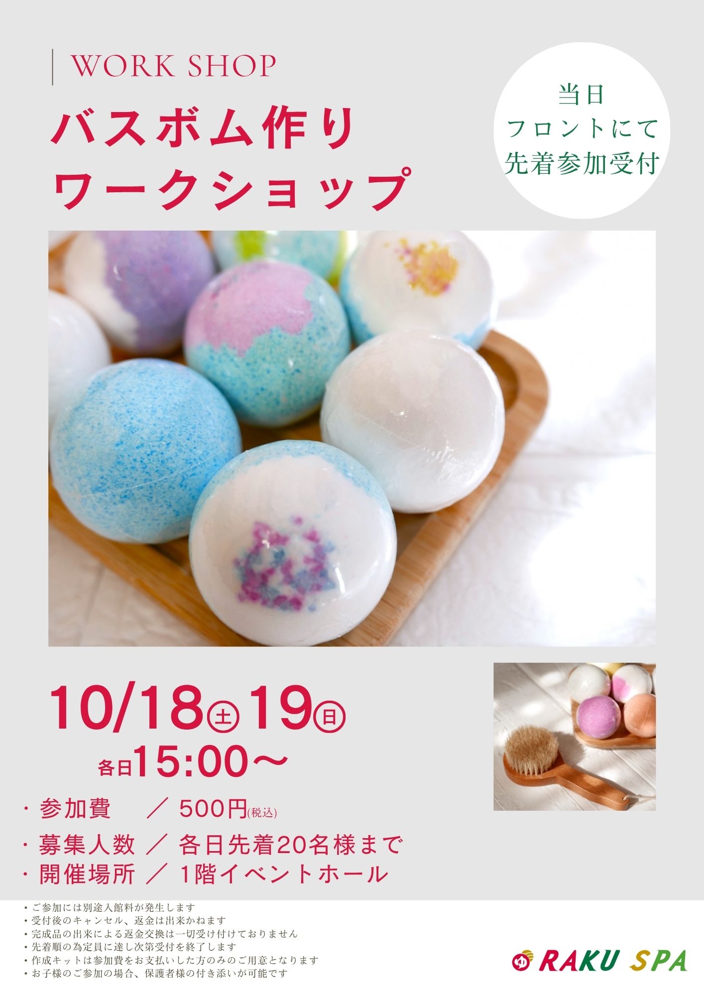 10/18(土)19(日)バスボム作りワークショップ 2025年10月11日 🛀10/18(土)19(日)バスボム作りワークショップ🛁 こんにちは!! RAKU SPA 鶴見です♨ お家のお風呂で使えるバスボム作りの ワークショップを開催します! オリジナルバスボムを作ってお持ち帰りできます!