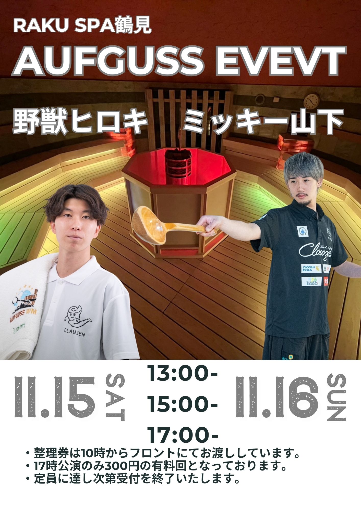 11月熱波イベント🔥 2025年11月12日 🔥熱波師「野獣ヒロキ&ミッキー山下」 こんにちは!! RAKU SPA 鶴見です♨ 【11月熱波イベントのご案内】 11月15日(土)熱波師「野獣ヒロキ」&11月16日(日)熱波師「ミッキー山下」 がRAKU SPA 鶴見に再登場! 世界大会で培った華麗なるタオル捌きを是非ご体感ください。