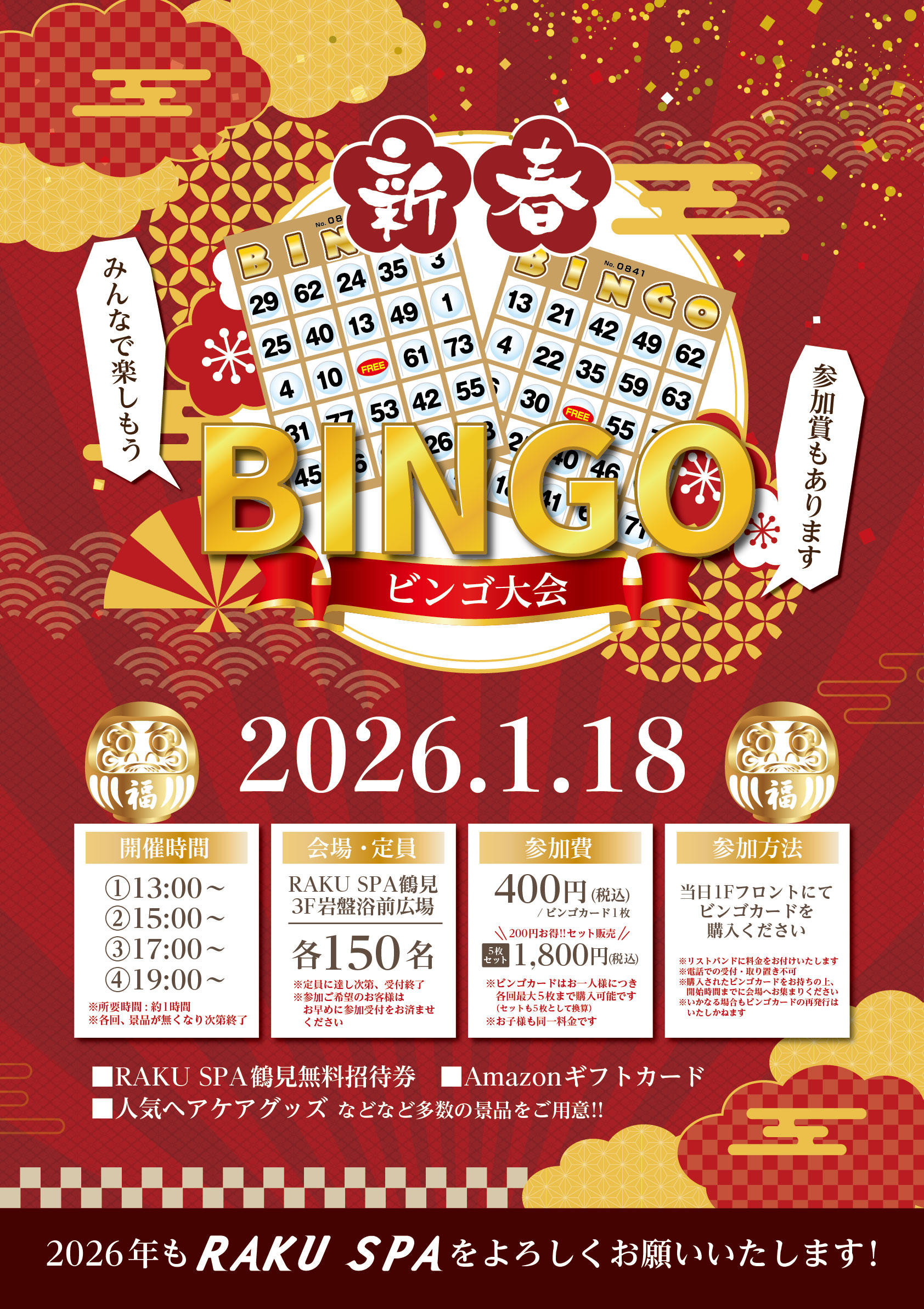 新春ビンゴ大会開催! 2026年01月10日 \新春ビンゴ大会開催!!/ 大人気イベントのビンゴ大会、1月18日(日)に開催決定!!🎍 RAKU SPA鶴見の無料招待券の他、人気ブランドヘアケアグッズやAmazonギフト券など 豪華景品が当たるチャンス!🎁 新年の思い出作りに!ぜひご参加ください🌅 ※イベントのご参加にはご入館が必要です