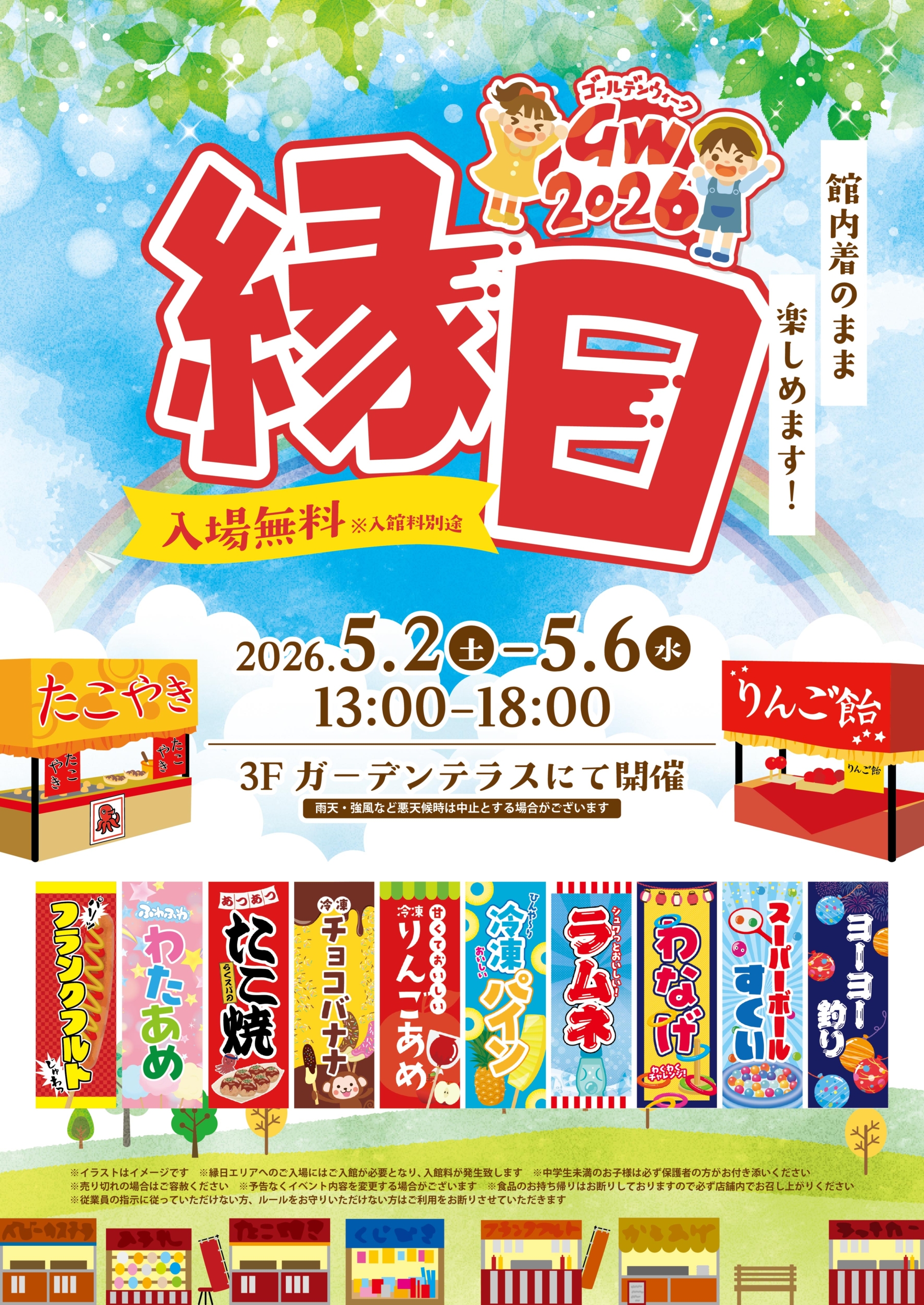 5/2(土)~5/6(水)RAKUSPA縁日 2026年04月23日 3階ガーデンテラスにてRAKUSPA縁日を実施いたします!! 様々なゲームや屋台グルメをご用意しております!!皆様のご来店お待ちしております!