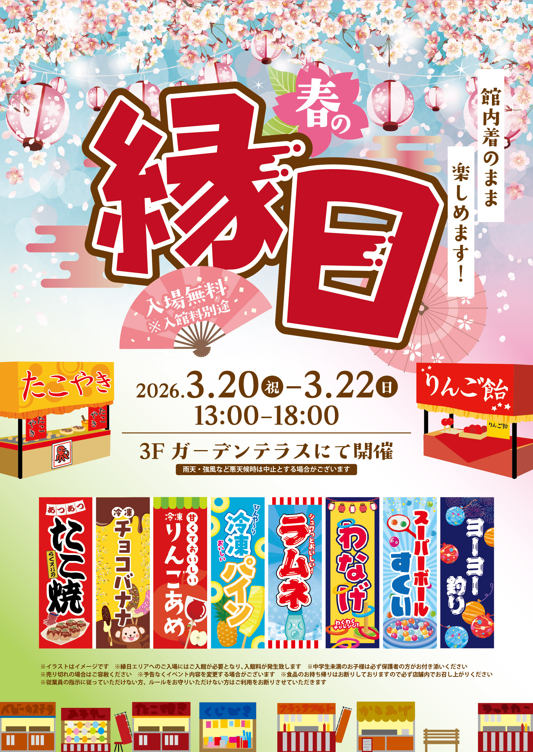 3/20(祝)~3/22(日)らくスパ縁日 2026年03月08日 3階ガーデンテラスにてRAKUSPA縁日を実施いたします!! 様々なゲームや屋台グルメをご用意しております!!皆様のご来店お待ちしております!