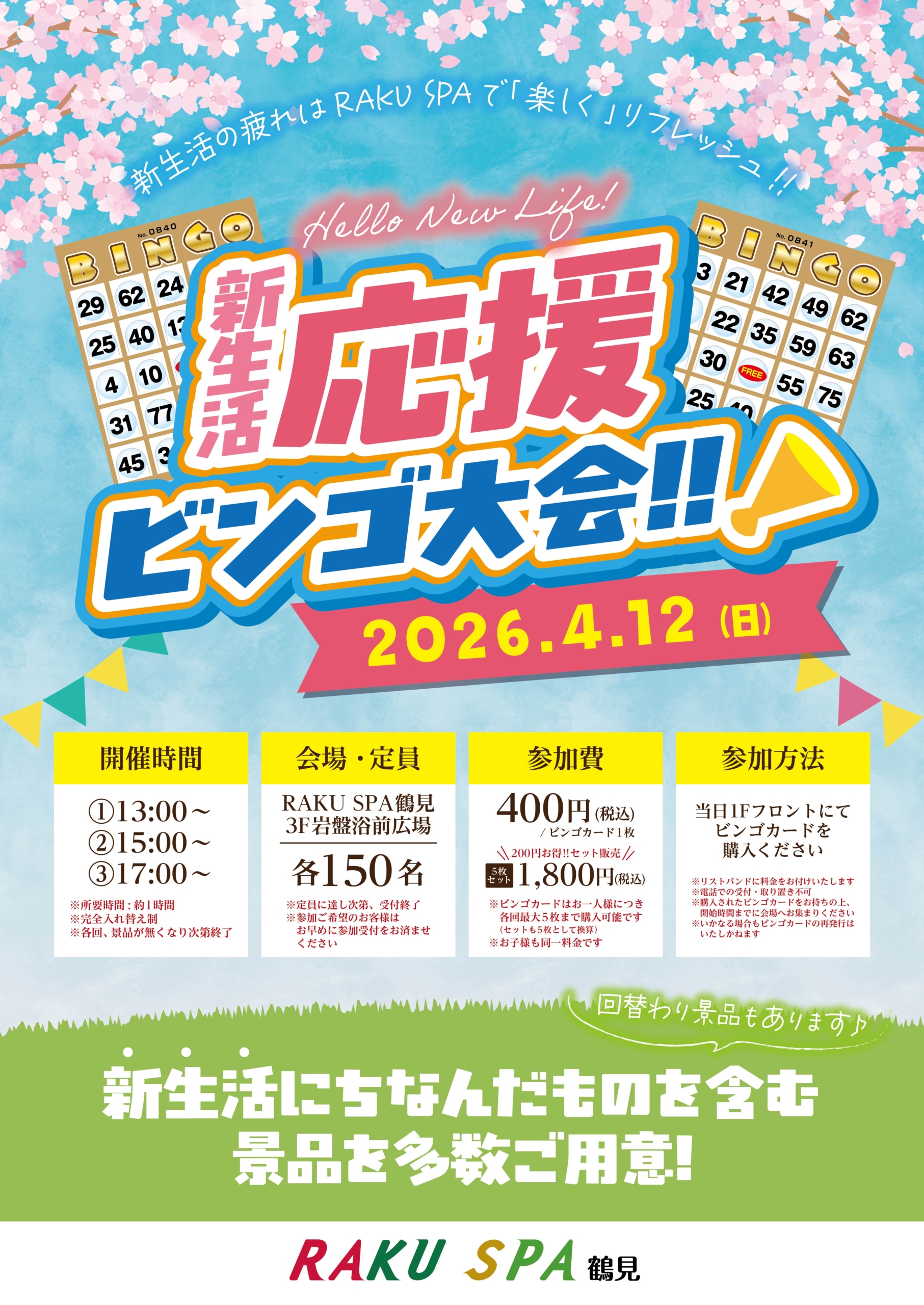 4/12 新生活応援ビンゴ大会開催!🎈 2026年04月05日 4/12(日) 新生活応援ビンゴ大会開催!! 大人気イベントのビンゴ大会、今回のテーマは「新生活」🌸 定番の景品のほか、新生活にちなんだ景品も多数ご用意しております! 新生活の疲れをRAKU SPAで「楽しく」リフレッシュしませんか?✨ 皆様のご来店お待ちしております! ※イベントのご参加にはご入館が必要です。 ※混雑時は入館制限をかける場合がございますので予めご了承ください。 ※イベント参加の前日受付及び電話受付は承っておりません。