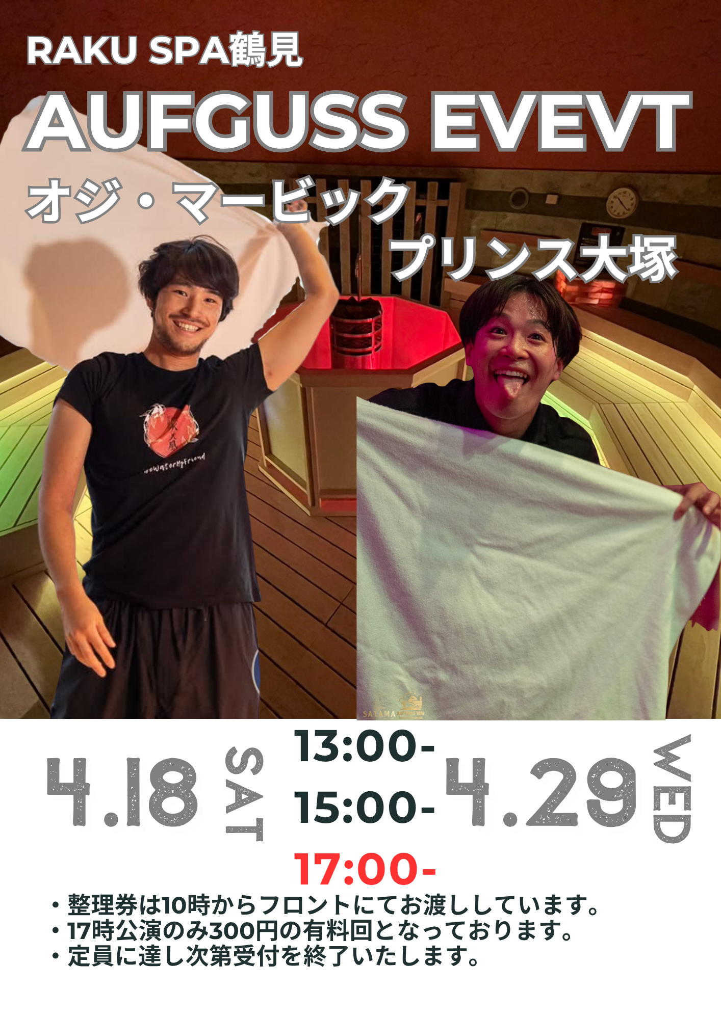 4月熱波イベント🔥 2026年04月11日 🔥熱波師「オジ・マービック&プリンス大塚」 こんにちは!! RAKU SPA 鶴見です♨ 【4月熱波イベントのご案内】 4月18日(土)「オジ・マービック」 4月29日(水/祝)「プリンス大塚」 がRAKU SPA 鶴見に再登場! 改装したサウンドロウリュ房で開催します🎉