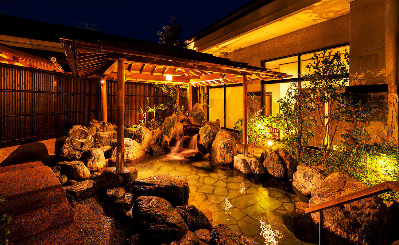 流れる湯の音色と四季の緑に心安らぐ露天岩風呂。低張アルカリ単純温泉を使用しており、神経痛や冷え症、疲労回復に効果があるといわれています。